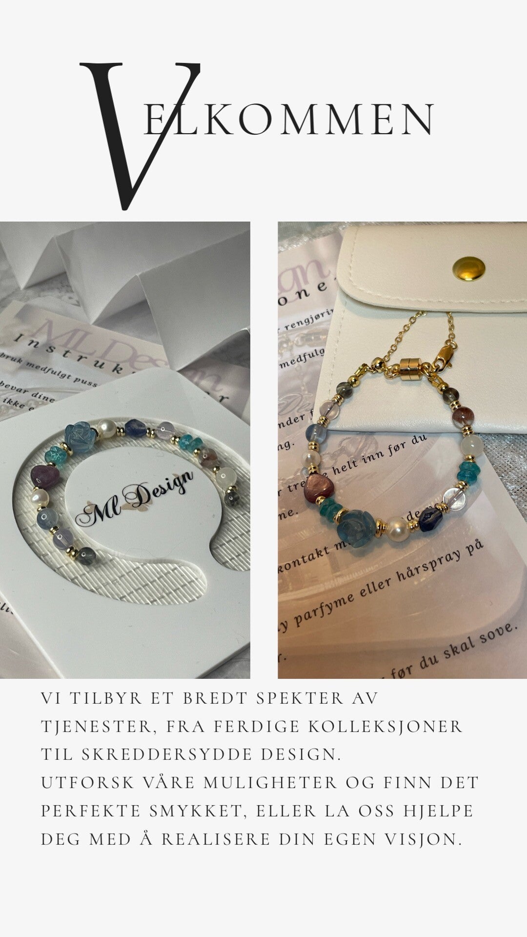 Heisann! Jeg heter Marie, og jeg starta med ML Design pga min interesse for krystaller og gleden det gir å få være med å designe noe som er helt eget og unikt for dere. Vi har drevet med Custom Designs inne på TikTok Live i 1år, nå i januar. Vi selger mest innenlands, har hatt et par custom-bestillinger sendt ut til Usa og har hatt en fin erfaring med det.