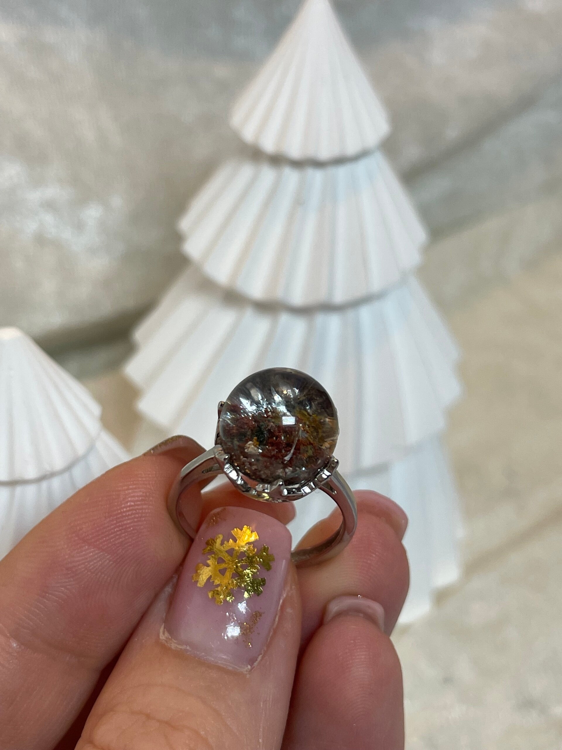 Dette er en nydelig og unik ring med rund krystall perle med helt klart innsyn i kvartsen, justerbar setting i s925.